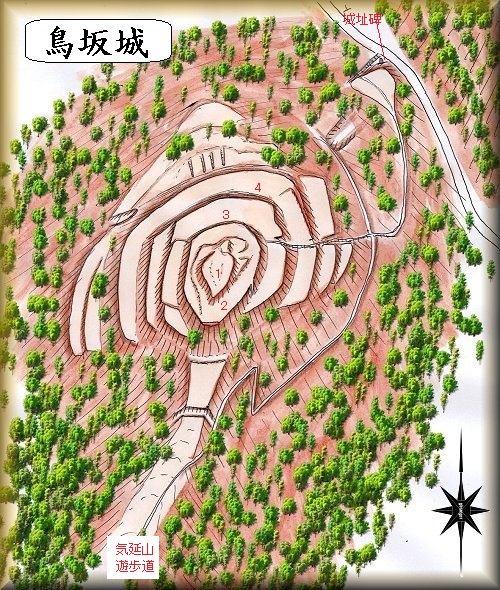 鳥坂城は、地形なりに同心円状に郭を造成した山城である。阿波にはこのような形状の山城が他にも見られ、阿波の在地勢力の城館の1つの典型であったのかもしれない。