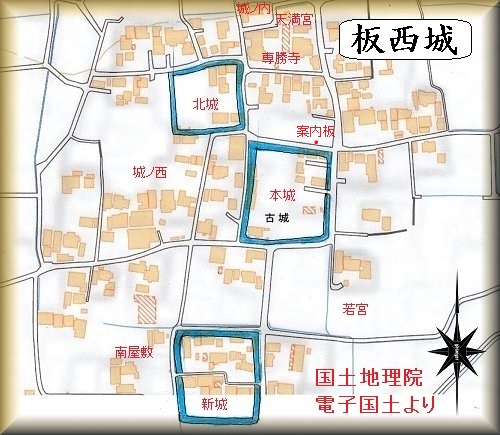 専勝寺の南側の「古城」と呼ばれる一帯が、板西城の跡である。しかし、現状では宅地化・耕作化によって遺構は消滅してしまっているが、すぐ北側にある神社の前に案内板が設置されている。。