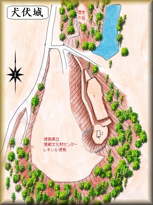 犬伏城は、板野町犬伏にある徳島県立埋蔵文化財センター「レキシル徳島」の東側にあった。ということで、この施設を目指していけばよい。駐車場もレキシルの駐車場を利用させていただいた。