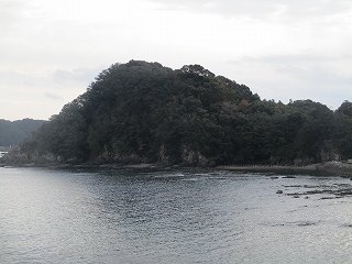 | 北側から遠望する加島。東側は断崖絶壁となっている。 | 西側の民宿の入口から遠望する加島。かつては独立した島であったという。 |
