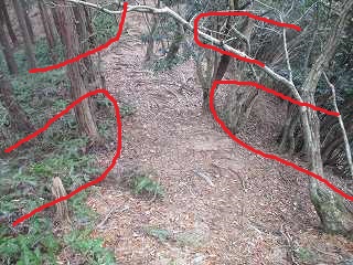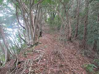 神社の右側に回り込んで行くと、山稜への山道が付けられていた。そこから尾根に出て城址方向に進んで行く。