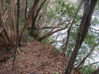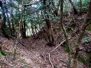 その先は自然地形の平場になっていて、先端にやはり中央部に土橋を残した堀切のようなものが2本見られる。城域はここまでであろう。簡素な山城であり、規模も大きなものではなかった。