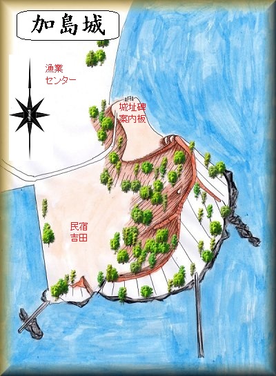 海陽町浅川加島の民宿吉田の背後にそびえる比高40mほどの山稜が加島城の跡であり、googlemapにも掲載されている。