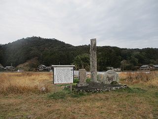 | 南麓の吉野城居館跡から遠望する吉野山城。ここからの比高は90mほどある。 | 居館跡の城址碑。「吉野城址」とある。 |