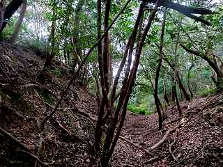| その先端の郭の先にも竪堀状の地形が見られる。 | 再び1郭北側の堀切。 |