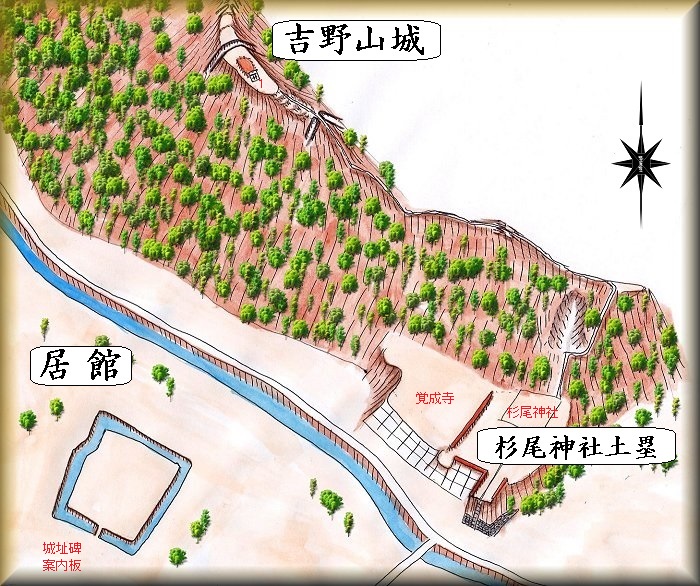 吉野山城の南側の平野部に吉野城居館の跡があり、城址碑が建てられている。城址碑には「吉野城址」とあるので、地元としては居館を「吉野城」、山城はそのまま「山の城」などと言うように認識しているのであろう。