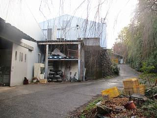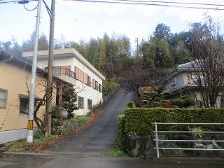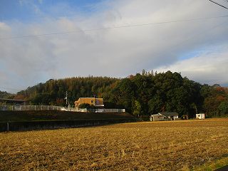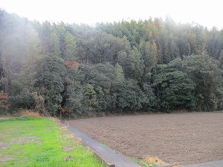 | 北側から遠望する新居見城。ここからの比高は50mほど。 | 分かりにくいが、北側にある入口。 |