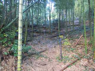 | 1郭との間の尾根部分に標柱が立て架けられているが、文字はよく読めない。 | 尾根側面部の土塁状地形。 |