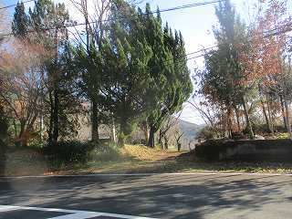 | 南方から遠望する中西城。ここからの比高は40mほど。 | 宗教施設跡への入口の道路。 |