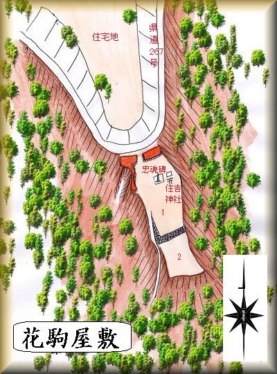 三好市池田町白地井ノ久保にある住吉神社のある台地先端部が花駒屋敷の跡である。吉野川に臨む断崖上の地形である。