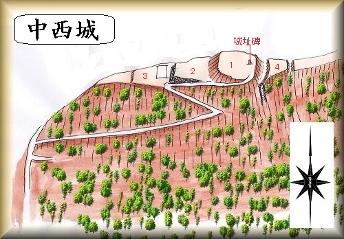 中西城は、これらの3つの郭によって構成された城であった。郭数は3つだけであるが、それぞれまとまった広さがあるので、ある程度の人数を籠めることは可能である。