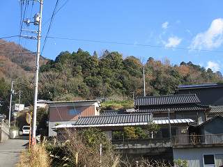 | 千尋衣神社の背後が城址となっている。ここからの比高は70mほど。車はここに停めさせていただいた。 | 西側の民家の脇に峠道への入口がある。 |