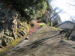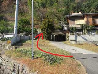 神社から西側に120mほど進んだところの民家の脇に、尾根上にアクセスするための古い山道が付けられている。入口はこの部分である。