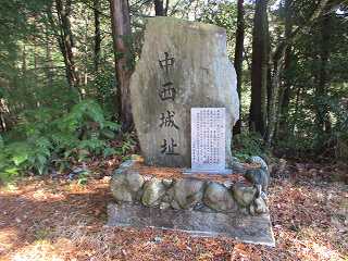 さらに1郭の側面部を回りこんで行くと1郭内部に到達する。1郭は長軸30mほどの楕円形の区画で、しっかり削平されている。1郭には「中西城址」と刻まれた立派な城址碑も建てられている。
