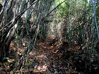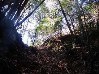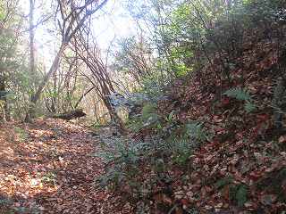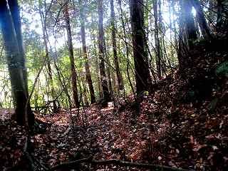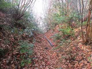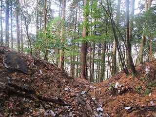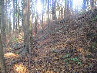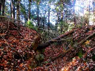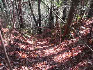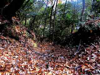 | そのまま古道を進んで行くと、その先の尾根との間の切通しの所に出る。そこから古道は城の東側側面部を通って行く。 | 1郭南側の堀切。 |