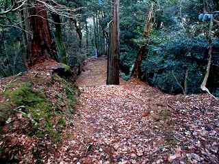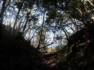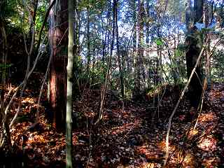 | 駐車場からの景色。ものすごく高所にあるということが分かる。よくこんなところに城を造ったものだ。 | 東側下の切通し通路らしきもの。これが本来の登城路であったものか。 |