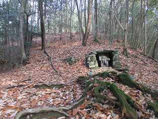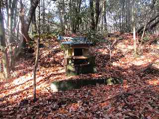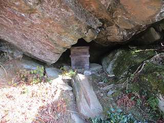 | 側面部の小さな堀切。 | 岩の下に祠が祭られている。 |