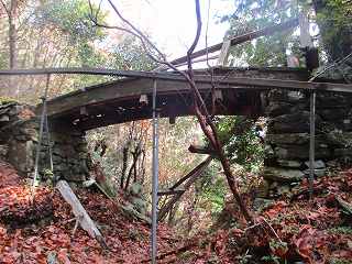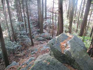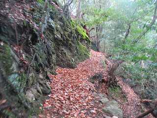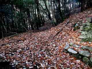 ここから先の尾根は細くて危険なので、旧道に沿って東側の斜面沿いの道を進んで行った。この道も急斜面に付けられているために、側面下部には石垣を構築している。こんな急斜面によくぞ石垣を積めたものである。ここまで整備しているところを見ると、かつては重要な街道だったものだろう。