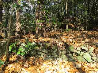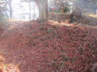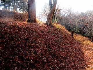 | 1郭の奥には土饅頭のようなものがあり、その上に石が敷き詰められている。 | 3郭の城塁。 |