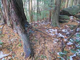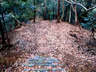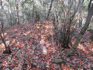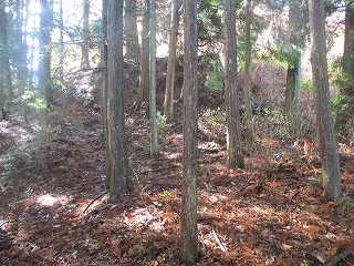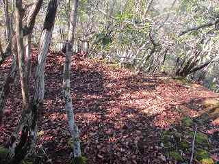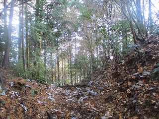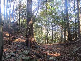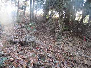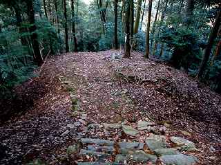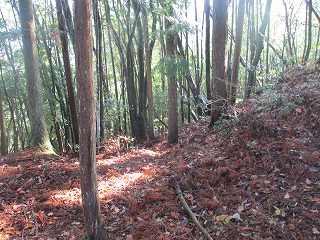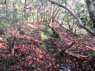 道路の余白に車を停めて、山道を登り始めると南側の尾根の側面部を通って5郭下の鞍部のところまで来た。ここからが城域内であると思われる。