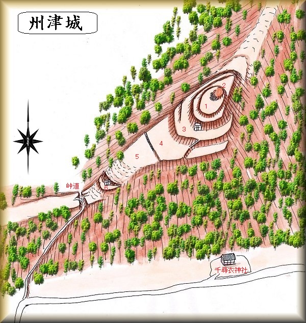 三好市池田町州津井関にある千尋衣神社の背後にそびえている比高50mほどの山稜が州津城の跡である。
