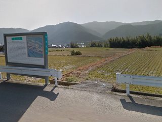 | 県道12号線沿いにある芝生城址への案内表示。 | 芝生城址。案内板があるが遺構はない。ただの水田である。 |