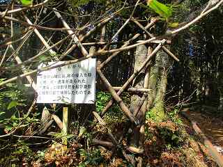 | その先のヤブの中に乱杭の案内が埋もれていた。 | 1郭虎口手前の柵。 |