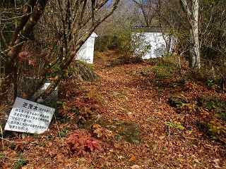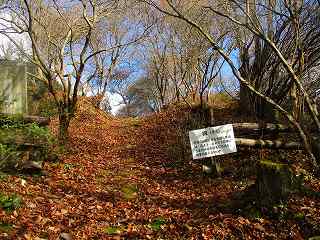 そうして道なりに進んで行くと一番上のお宅の前を通る。ここから先は心細くなるような林道となっている。一応、城址まで舗装路になってはいるのだが、現在では車が通ることはほとんどないらしく、道路には落ち葉がたまり、時々石も転がっている。舗装路とは思えない状態になっている。注意しながら進んで行った方がよい。