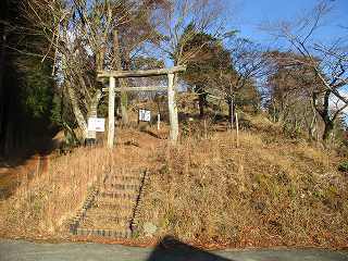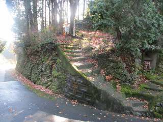 地形図を見てみると、下の鳥居の所からだと、かなり長い石段を登って行かなければならなさそうである。実際に鳥居のところまで来て見ると、気が遠くなるような石段が見えている。長い石段を登るのはきつい。そこで比較的アップダウンの少ない南側の尾根基部のところからアクセスすることにした。