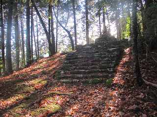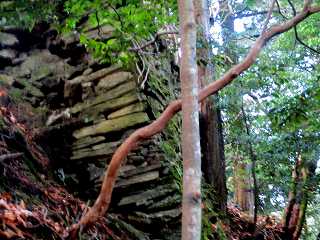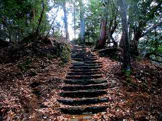 | 3郭石段。 | 1郭の側面部には平石を積んだ石積みがある。よくぞこのような急斜面に高く石を積むことができたものである。 |