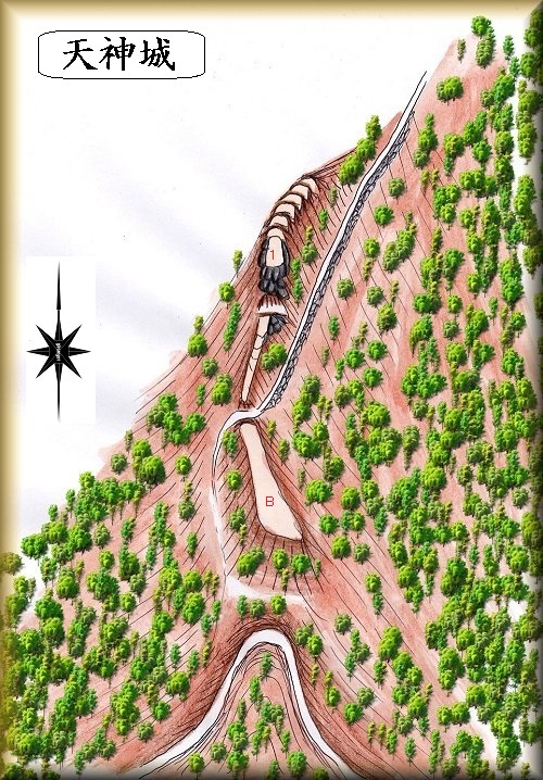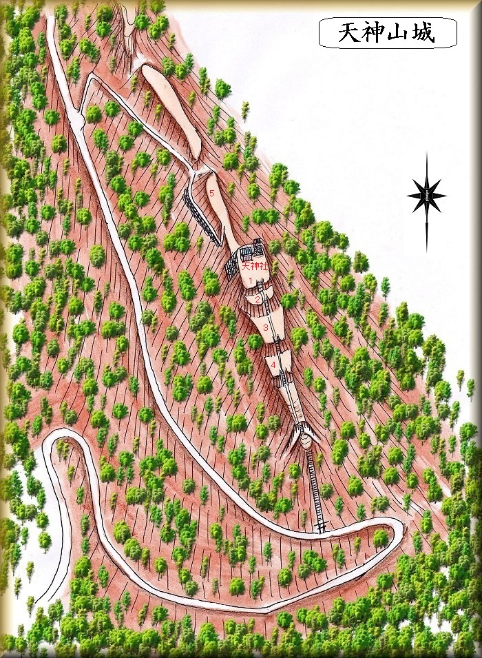 このように天神山城には削平された郭がいくつか存在している。とはいえ、急峻な尾根上の地形なので、すべてを合わせても、それほど大きなスペースは確保できない。多人数の籠城は困難で、緊急時の逃げ込み場所として意識されていた、といった程度のものであったろう。