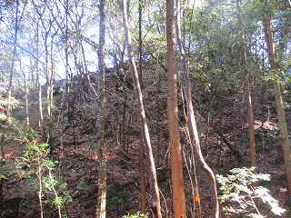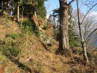 | その先にあるテラス状郭の小郭に祠が祭られている。 | テラス状郭の側面部。 |