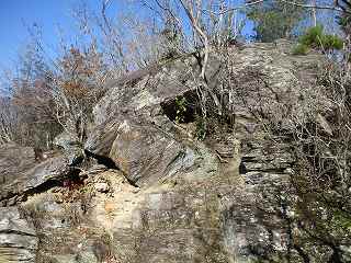| 1郭南側の岩盤。けっこう簡単に登れる。 | その下の堀切。 |
