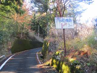 | だいぶ山稜の上の方まで来てやっと案内板が見えてきた。この場所である。ここからは道なりであるが、林道を3kmほどとは、遠いなあ・・。 | 運転が心細くなってから林道を2kmも進んで、次の看板が見えてきた。ここまでくれば、あと一息である。 |