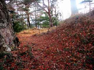 ここから5郭内部に上がって行く。5郭は尾根を削平したもので幅は狭いが長さはある。ここから下の通路を攻撃されたら通路にいる人はひとたまりもない。