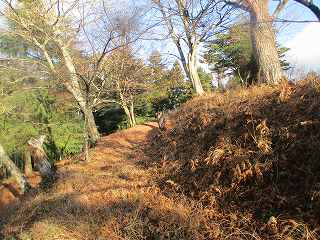 | 1郭南端の石垣であるが、後世のものである。 | 1郭入口の土塁。幅が広く、高さは低い。 |