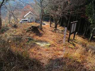| 林道は心細かったが、城址には駐車場とトイレが設置されていた。 | 鳥居の奥にある案内板と標柱。 |