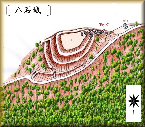 三好市井川町井内西の集落の一番高い山稜上部が八石城の跡であり、比高600mもの高所に築かれた山城である。googlemapにも掲載されている。