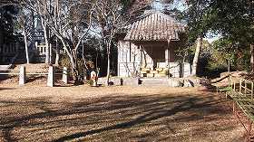 | 西側から遠望する牟岐城。比高40mほどの台地である。城内はどこもかしこも墓地となって改変されている。 | 1郭に祭られている観音堂。 |
