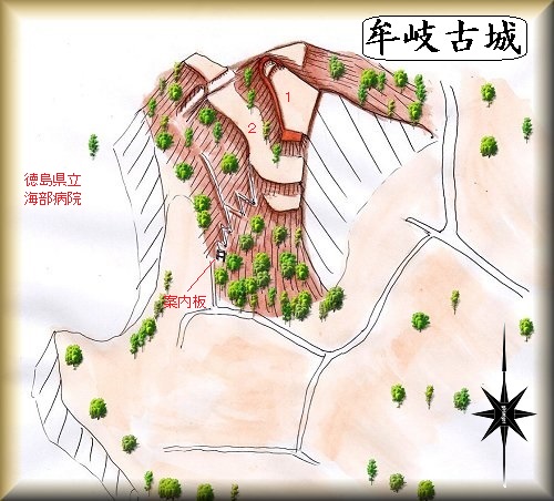 徳島県立海部病院の東側にそびえている比高50mほどの山稜が牟岐古城の跡である。この場所のお宅の前まで来ると、脇の路地の先に案内板が立てられているのが見えてくる。