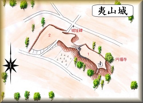 徳島市八万町夷山にある円福寺背後の比高10m程の低い丘陵が夷山城の跡である。ということで、この寺院を目指していけばよい。ところが周囲の道は狭く、車を停めて置ける場所もないので、訪問には苦労する場所である。