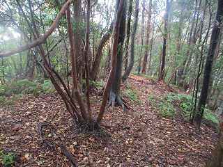 尾根を南に進んで行くと堀切が見えてくる。ここから先が城内である。堀切の東側には竪堀はないが、西側は下方が削られており、竪堀のようにも見えるのだが、竪堀にしては幅が広すぎるようでもある。