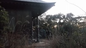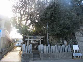 | 先端の河口番所下にある水神社。周囲はコンクリート加工されていて、どこから登るのか分からない。 | 津田寺の背後の城址への登り口。 |