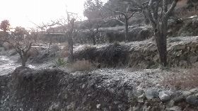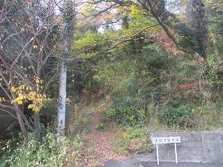 | 北側の段々畑の石垣。後世の改変であろうか。 | 北側の入口に立てられた標柱。 |