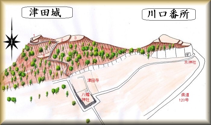 以上が津田城の主要部分であるが、東側下方の山稜部分にも削平地が見られ、津田城の出城があった場所であると思われる。こちらは近世には川口番所という施設が置かれ高櫓も設置されていたという。