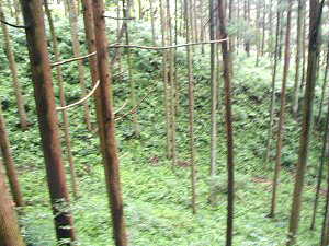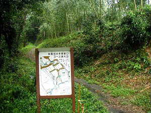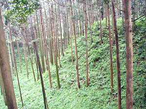大堀切。この写真ではよく分からないが、すごく深い。最も深いところでは20mほどはありそうだ。幅も最も広いところでは40mほどある。あまり深いので、自然地形を利用しているのではないかと思えるのであるが、実際の所、深い堀はあっちこっちにある。となると、やはり上から掘り下げていったものか・・・・。こうした堀を掘るのにどれだけの労力が必要だったことであろう。想像するだに気が遠くなってしまいそうだ。
