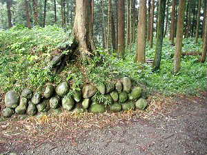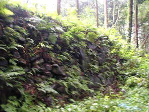 本丸虎口の土塁下の石垣。遺構ではないかもしれないが、土塁の根石として崩落防止のために置かれている。