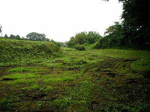 御前郭から下に降りて、北側の丸馬出しに行く。これは丸馬出しの堀部分。深さは1mほどで、防御性は薄い。畑地の造成で埋められてしまったものか。「丸馬出し」と案内の標柱が建っているが、本当に丸馬出しなのか、いまひとつ分かりにくい。