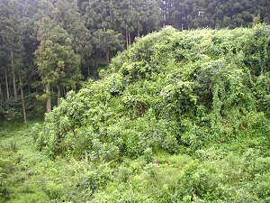 そして、この城や暮れ方の鷹留城などを歩いて川原湯温泉の宿に着くと、そこには「歓迎 チバラギ薮の会様」の文字が・・・・・。(これについては埋もれた古城の丸岩城のページをどうぞ) 「薮の会って、なんじゃこりゃー! 誰がこんな名前つけたんだよ〜」と思ったのであるが、ふと自分の格好を見ると、泥だらけの黄色い長靴、汗まみれのTシャツ、そして蜘蛛の巣の張り付いた頭・・・・・・これではいかにも薮の会そのまんまの姿であった。さらにいうならば「薮と嵐の会」といってもよさそうだ・・・・・・。
