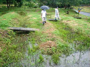 03.8.9 この日、ヤブレンジャーのメンバーと共にこの城を訪れた。(ヤブレンジャーの詳細は丸岩城のページをどうぞ) 折から台風10号が到来し、雨が降りしきる。この台風はゆっくりと日本列島を縦断し、九州から北海道までかなりの被害をもたらしていた。それが群馬北方を移動しているさなかに箕輪城を探索することになった。どの郭に行っても雨、雨、風、そしてまた雨。有名な城郭で休日であるのにもかかわらず、他に箕輪城を探索している者は人っ子一人いない。雨には慣れているとはいえ、なかなかしんどい。
